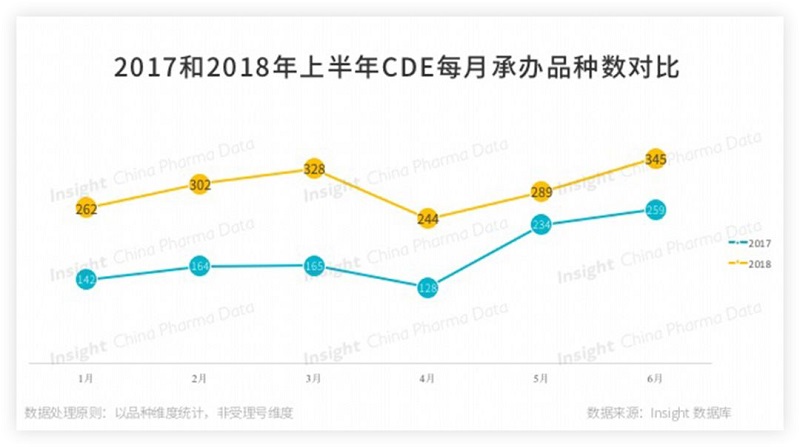 據丁香園 Insight 數據庫統計, 2018 年 CDE 共承辦 3553 個受理號,共涉及 1770 個藥品品種,同比去年增加 62%(去年承辦 1092 個品種),每月約承辦 300 個品種。