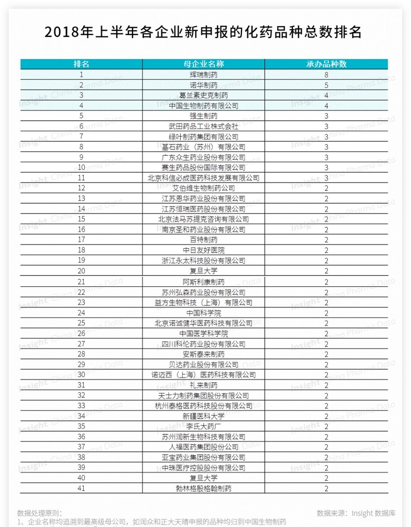 備注:本文統計數據來源丁香園 Insight 數據庫,統計緯度均為品種,企業均按照母企業計,數據統計截止日期為 2018 年 6 月 30 日,時間以 CDE 承辦時間為準。