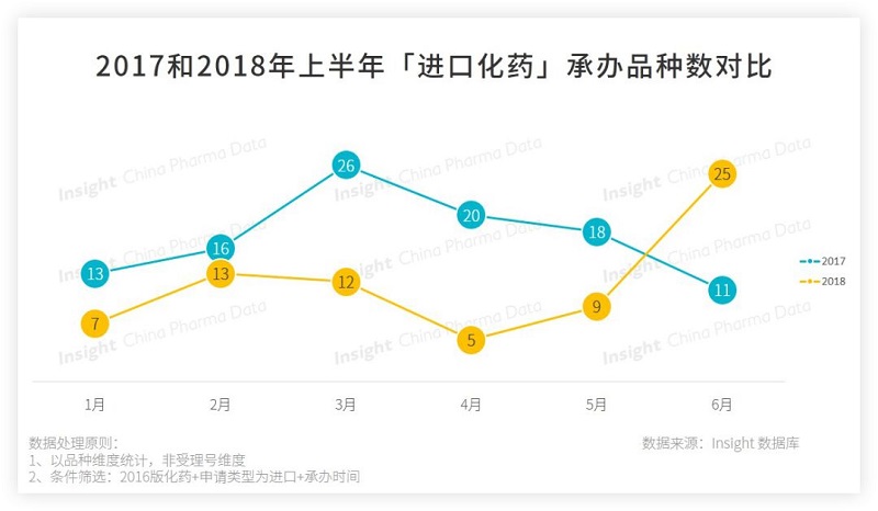 今年上半年進口藥申報品種數量為 71 個,在 5 月,2018 年上半年進口化藥承辦數量前均低于 2017 年同期,2018 年 6 月藥品申報出現了一個小高峰,該月進口化藥申報品種數量為 25 個,這可能與今年陸續出臺的調整進口藥品注冊管理有關事項的決定有關,在政策上是鼓勵進口藥申報的。