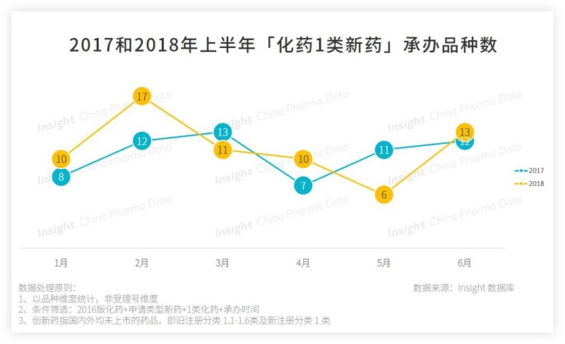 2018 年上半年共有 67 個化藥 1 類新藥申請,新藥隊伍在不斷地壯大,相較去年而言,今年每月申報的 1 類新藥數量上沒有規律可循。