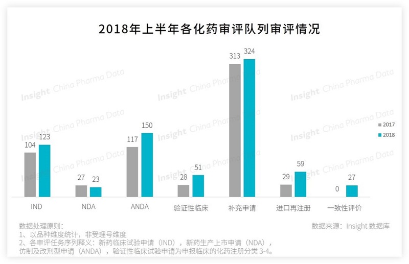 2018 年上半年化藥完成審評的隊列主要集中在 ANDA 和補充申請和 IND 。