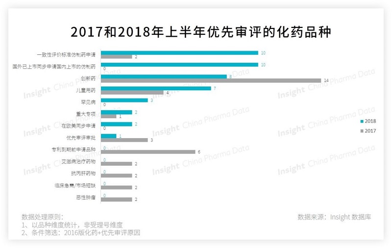 相比去年,今年在歐美同步申請、重大專項、罕見病、兒童用藥、國外已上市同步申請國內上市的仿制藥和一致性評價標準仿制藥申請這 6 個優先審評類別上,獲得優先審評審批資格的藥品數更多。