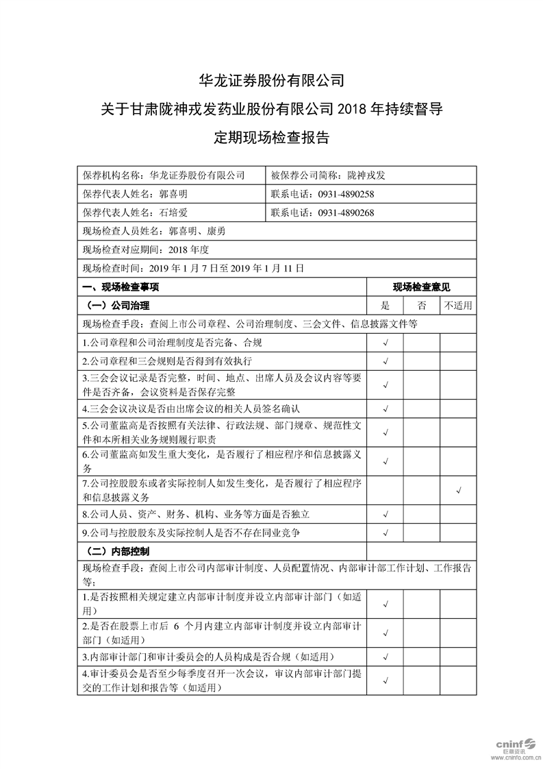 華龍證券股份有限公司關(guān)于甘肅隴神戎發(fā)藥業(yè)股份有限公司 2018 年持續(xù)督導(dǎo)定期現(xiàn)場檢查報告