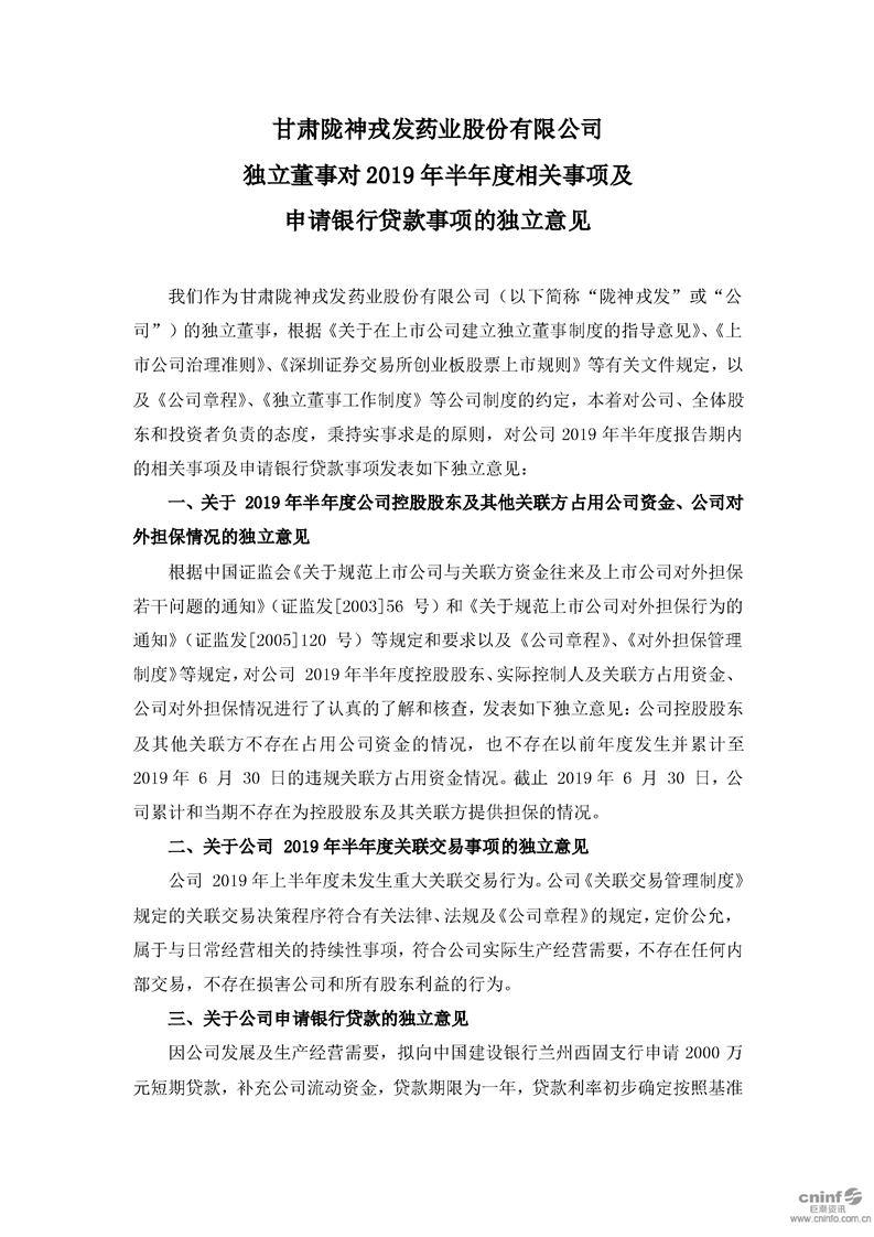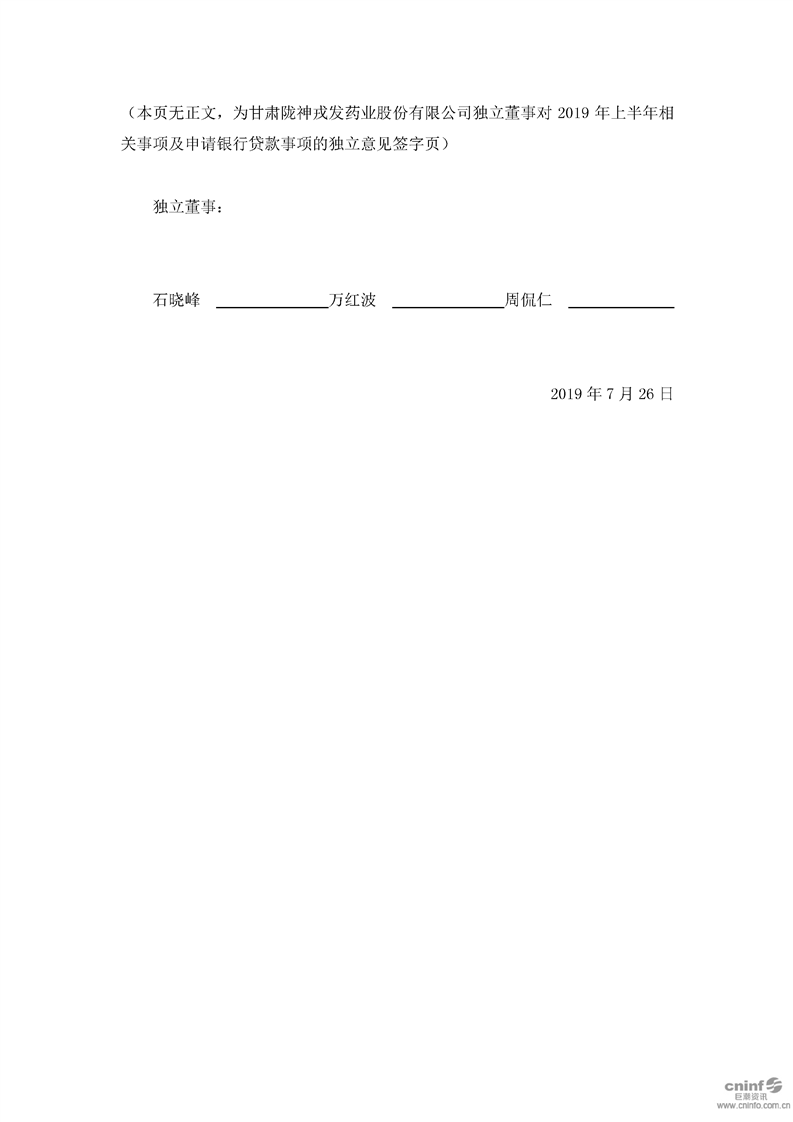 獨立董事對2019年半年度相關事項及申請銀行貸款事項的獨立意見