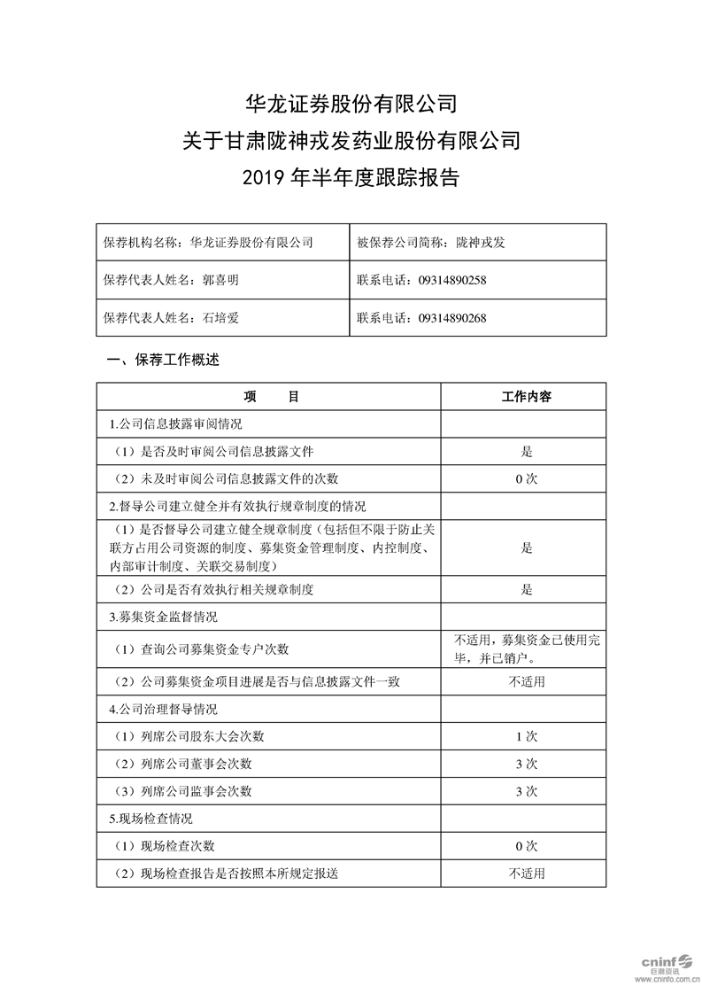 華龍證券股份有限公司關于公司2019年半年度跟蹤報告