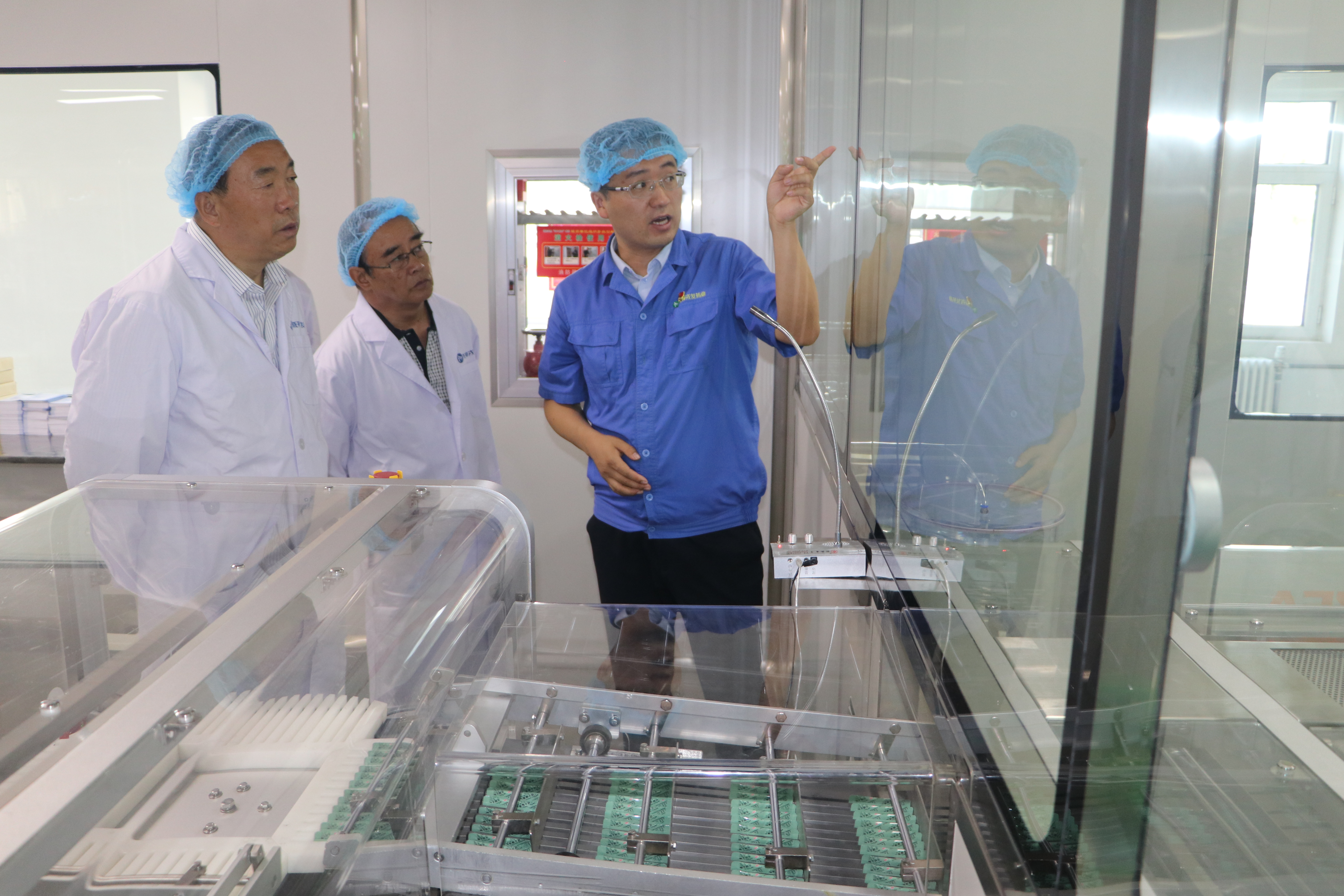 在制劑車間,錢雙喜向調研組一行講解了元胡止痛滴丸滴制、晾丸等的生產工藝流程,調研組一行在外包裝聯動線前觀看了元胡止痛滴丸內包及外包裝生產全過程。
