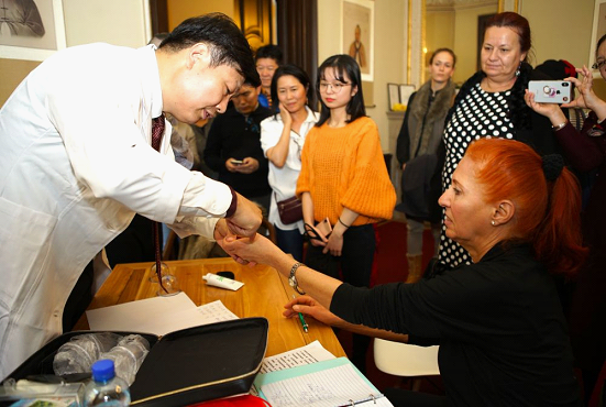 ↑2019年11月,世界針灸學(xué)會(huì)聯(lián)合會(huì)組織的“一帶一路”中醫(yī)藥針灸風(fēng)采行來到捷克,通過學(xué)術(shù)研討、展覽、科普講座、健康咨詢等各種方式與來自捷克醫(yī)學(xué)界的同仁探討中醫(yī)發(fā)展,向捷克民眾傳播中醫(yī)知識(shí)。圖為中醫(yī)專家在為患者診療。達(dá)娜·科什奈洛娃 攝