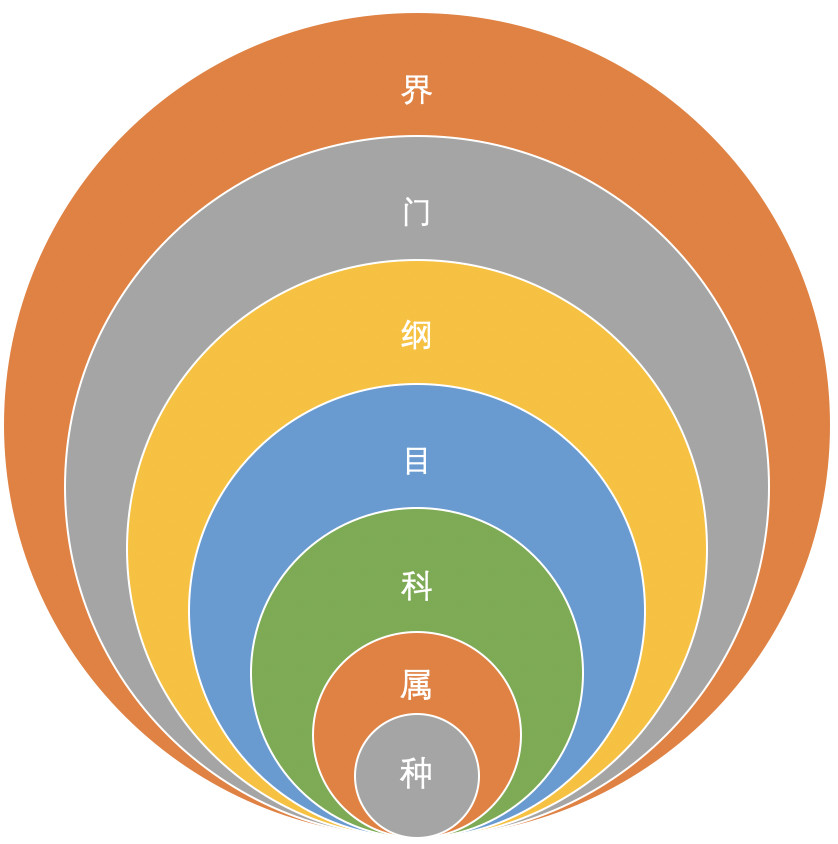 一般在生物學上,按照階元系統進行分類,通常包括七個主要級別:界、門、綱、目、科、屬、種。種是基本單元。從界到種,范圍逐步縮小。