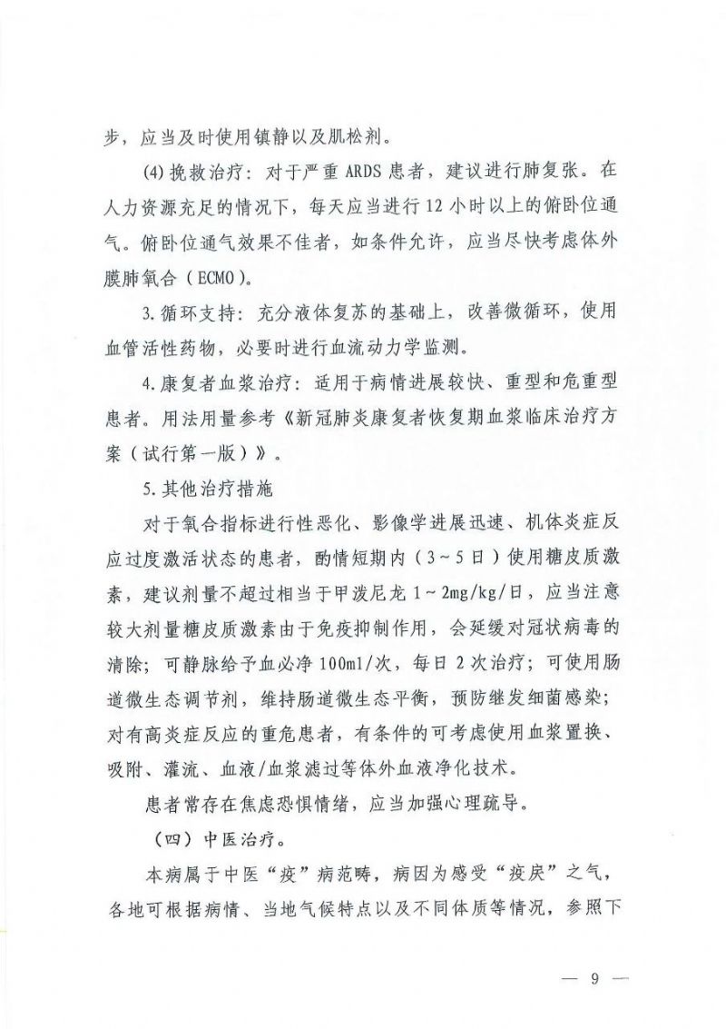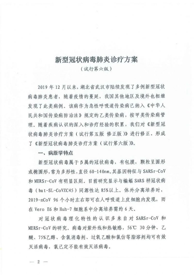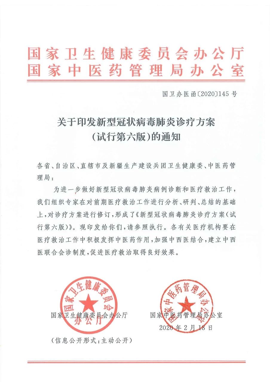 關于印發新型冠狀病毒感染的肺炎診療方案(試行第六版)的通知