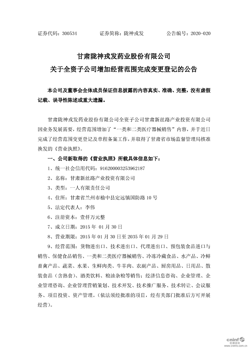 關于全資子公司增加經(jīng)營范圍完成變更登記的公告