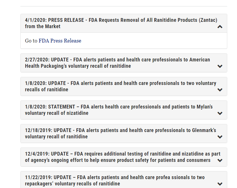 關(guān)于雷尼替丁中可能含有的致癌物,F(xiàn)DA 此前已經(jīng)發(fā)布了多次聲明。2019 年 9 月 13 日,F(xiàn)DA 在官網(wǎng)中第一次發(fā)布了提醒醫(yī)護人員/患者在雷尼替丁樣品中發(fā)現(xiàn)了 NDMA 的聲明。在當(dāng)時的聲明中,F(xiàn)DA 表示在幾個廠商的雷尼替丁藥品中發(fā)現(xiàn)了 N-亞硝基二甲基胺(NDMA),當(dāng)局正在評估正在評估雷尼替丁中低水平的 NDMA 是否對患者構(gòu)成風(fēng)險。當(dāng)時,F(xiàn)DA 沒有要求患者停止服用替尼替丁,但建議可以換用與雷尼替丁有相同作用的其他藥品。