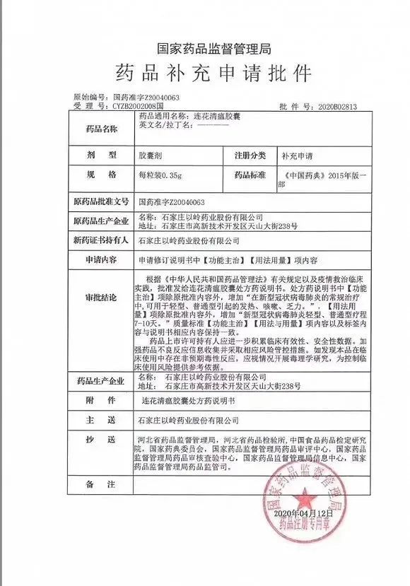 蓮花清瘟膠囊用于新冠肺炎的審批結論為“根據《中華人民共和國藥品管理法》有關規定以及疫情救治臨床實踐,批準發給蓮花清瘟膠囊處方藥說明書,處方藥說明書中【功能主治】項除原批準內容外,增加”在新型冠狀病毒肺炎的常規治療中,可用于輕型、普通型引起的發熱、咳嗽、乏力。
