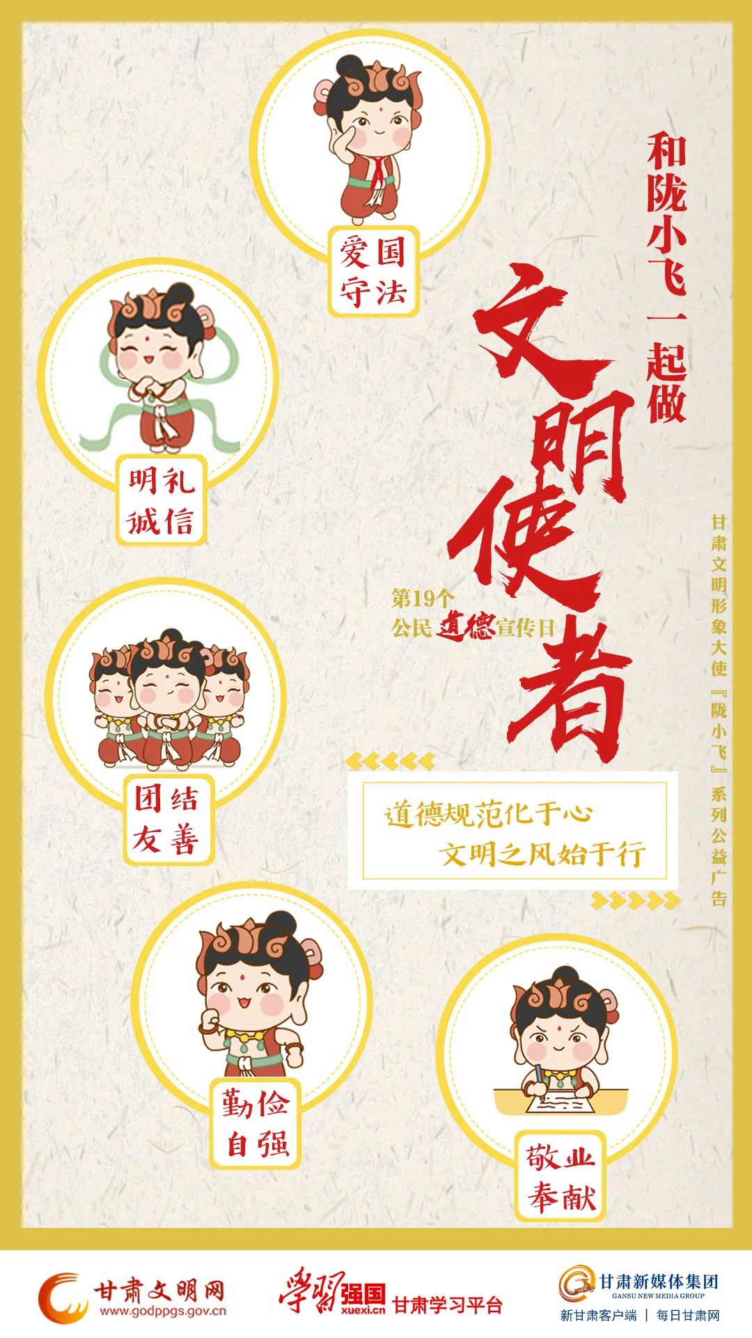 今年是中共中央頒發(fā)《公民道德建設(shè)實施綱要》20周年,為大力倡導(dǎo)“愛國守法、明禮誠信、團(tuán)結(jié)友善、勤儉自強(qiáng)、敬業(yè)奉獻(xiàn)”20字基本道德規(guī)范,省文明辦特推出“和隴小飛一起做文明使者”公益海報。