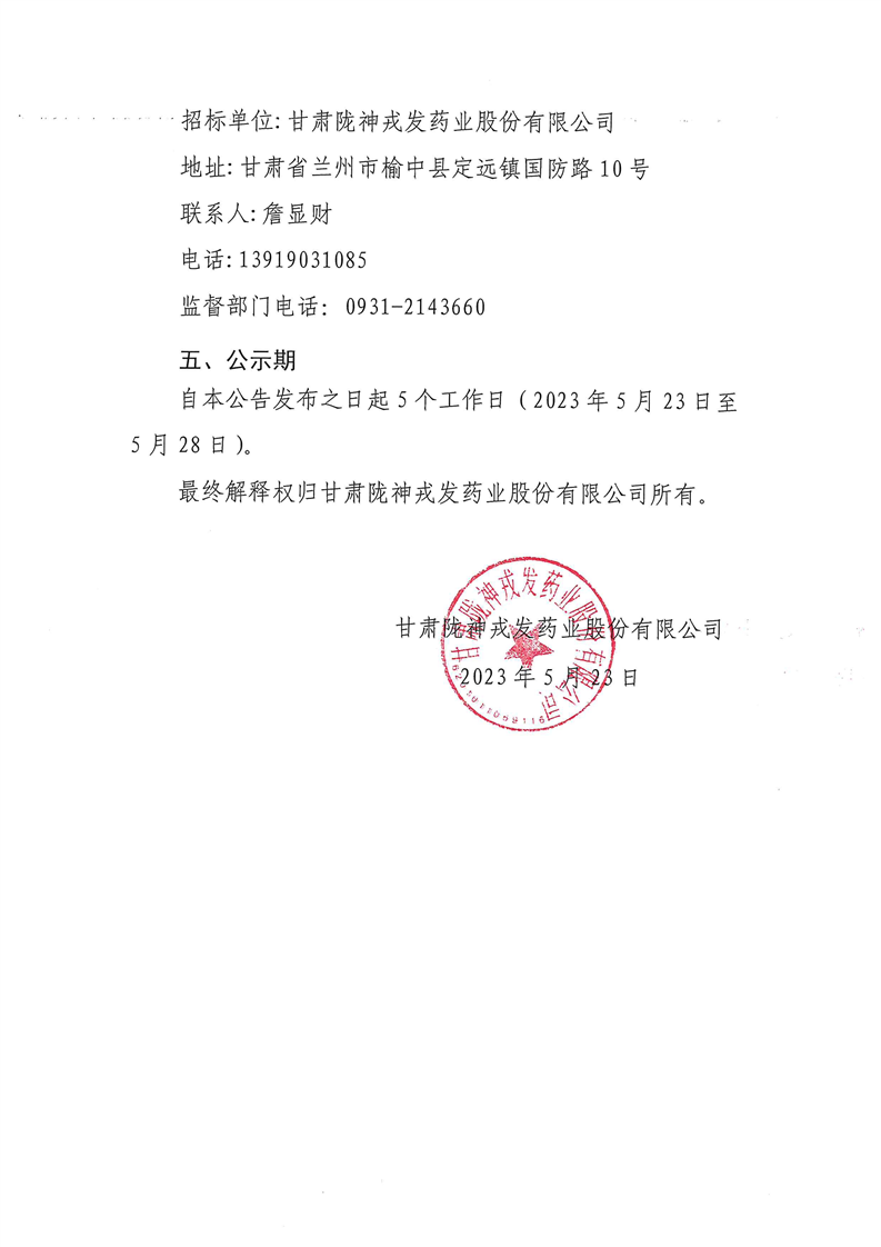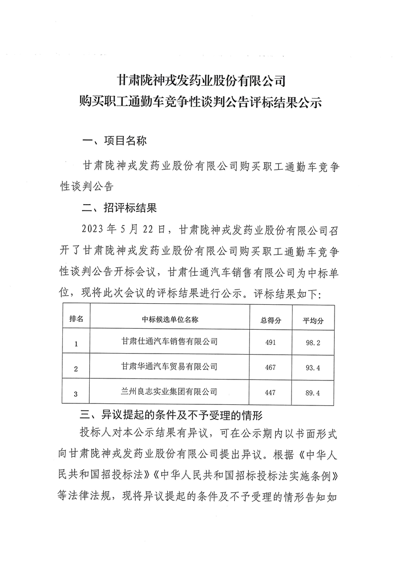 甘肅隴神戎發藥業股份有限公司購買職工通勤車競爭性談判公告評標結果公示