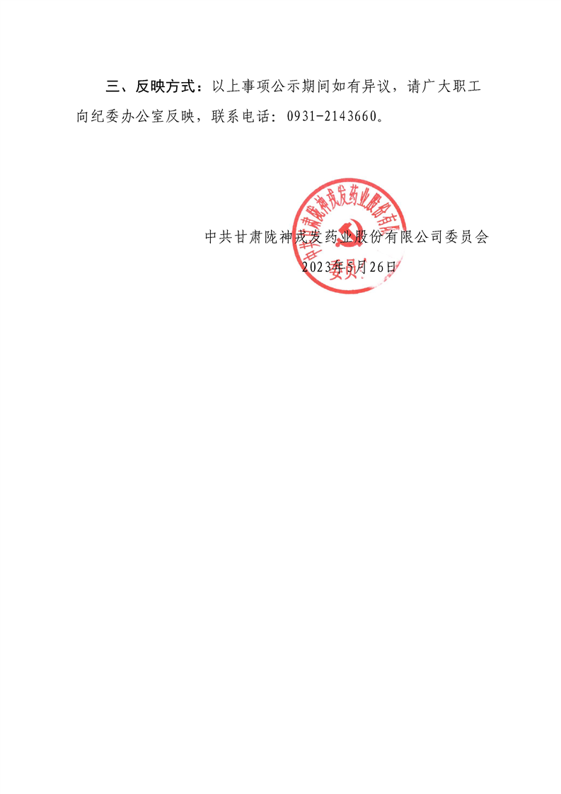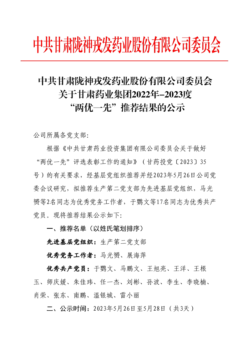 中共甘肅隴神戎發(fā)藥業(yè)股份有限公司委員會(huì)關(guān)于甘肅藥業(yè)集團(tuán)2022年-2023度“兩優(yōu)一先”推薦結(jié)果的公示