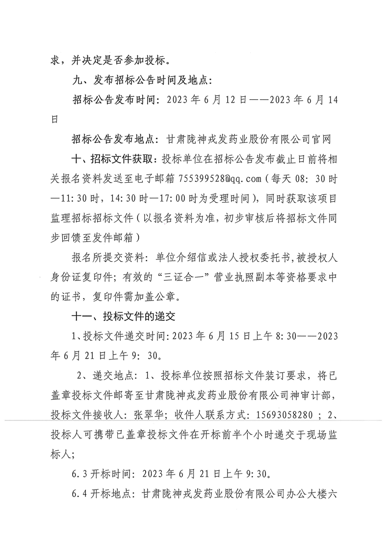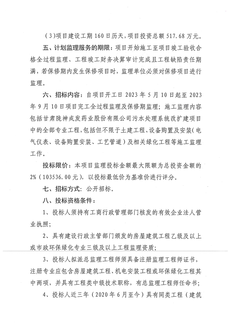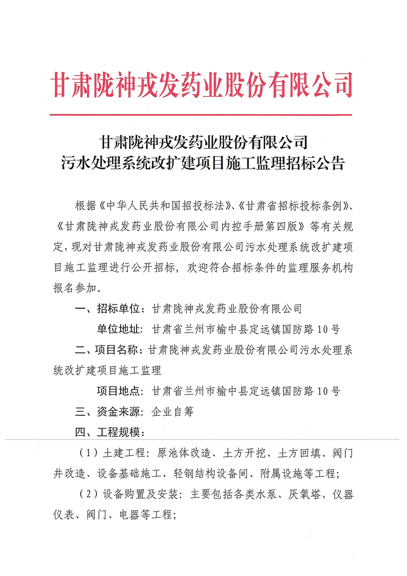 甘肅隴神戎發藥業股份有限公司污水處理系統改擴建項目施工監理招標公告