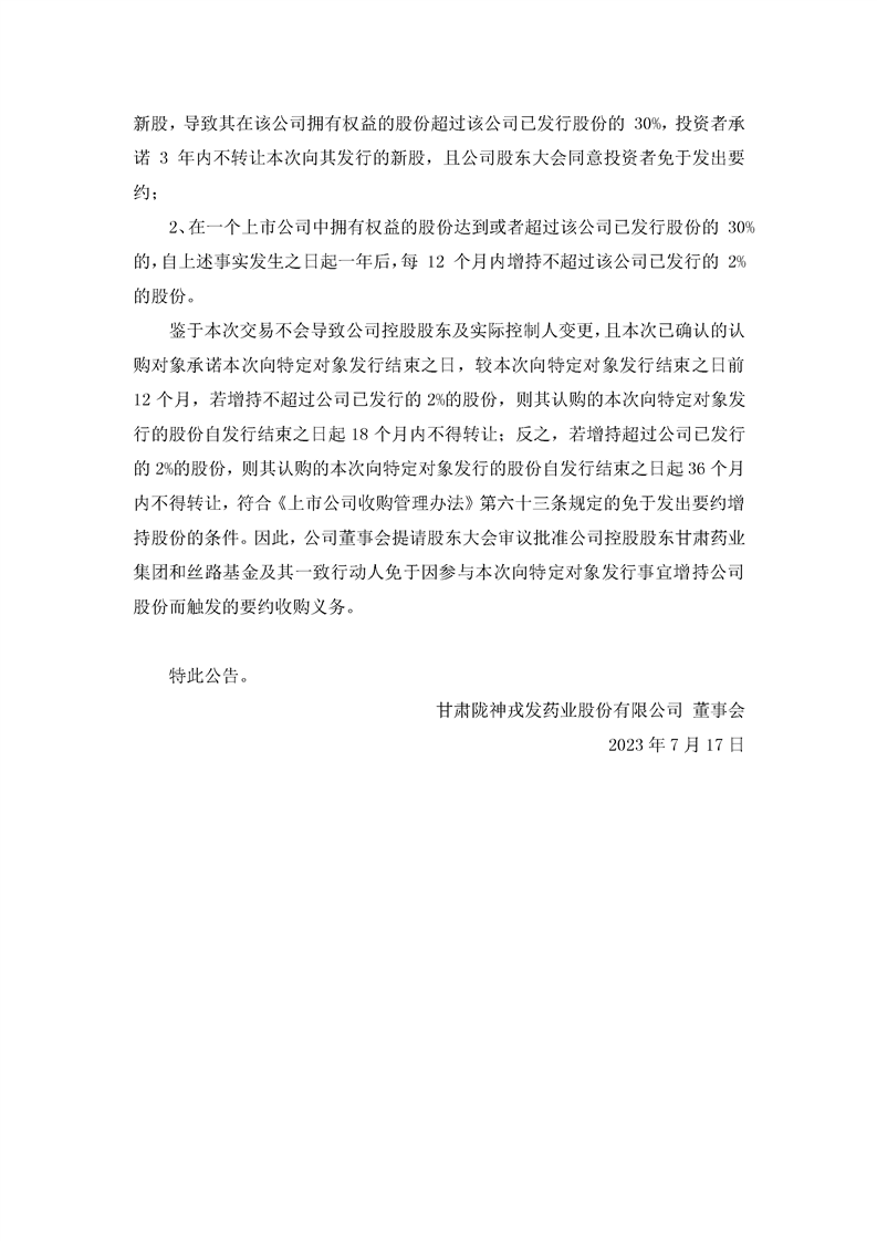 關于提請股東大會批準甘肅藥業投資集團有限公司及其一致行動人免于發出要約增持公司股份的公告