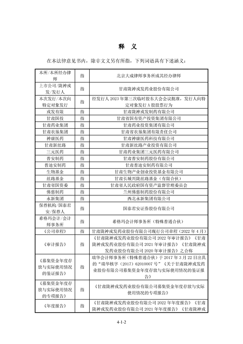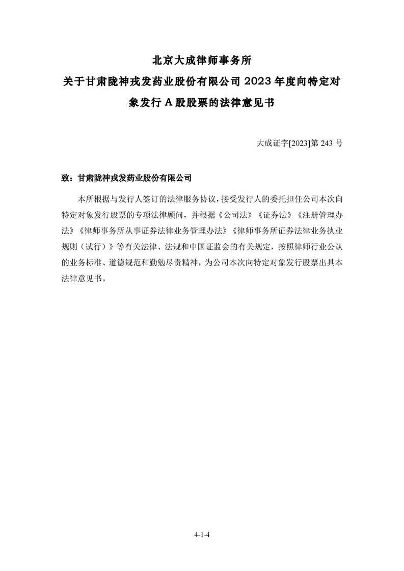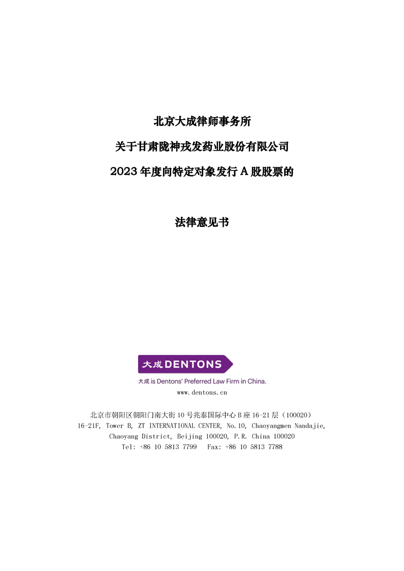 北京大成律師事務所關于甘肅隴神戎發藥業股份有限公司2023年度向特定對象發行A股股票的法律意見書