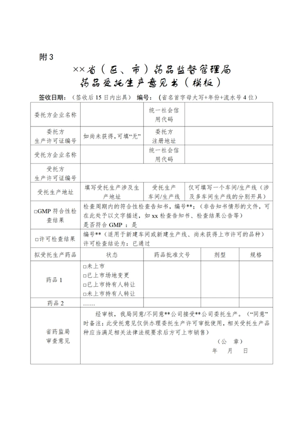 請于2024年12月10日前,將有關意見按照《意見反饋表》格式要求反饋至電子郵箱yaopinjianguan-2@nmpa.gov.cn,郵件標題請注明“受托生產監管公告意見反饋”。