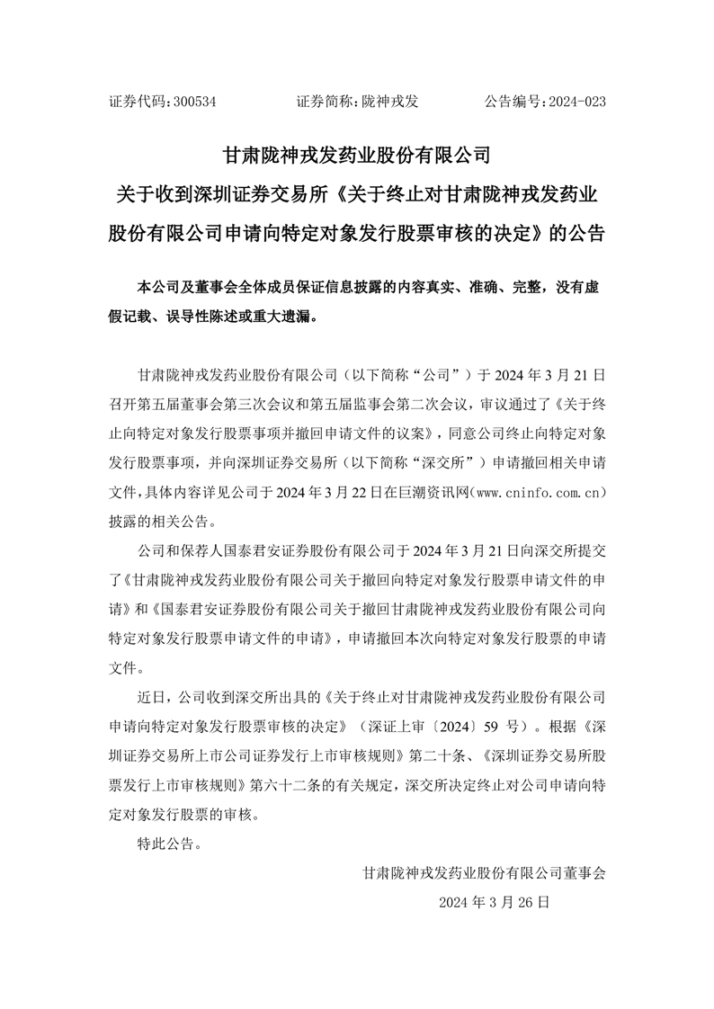 關于收到深圳證券交易所《關于終止對甘肅隴神戎發藥業股份有限公司申請向特定對象發行股票審核的決定》的公告
