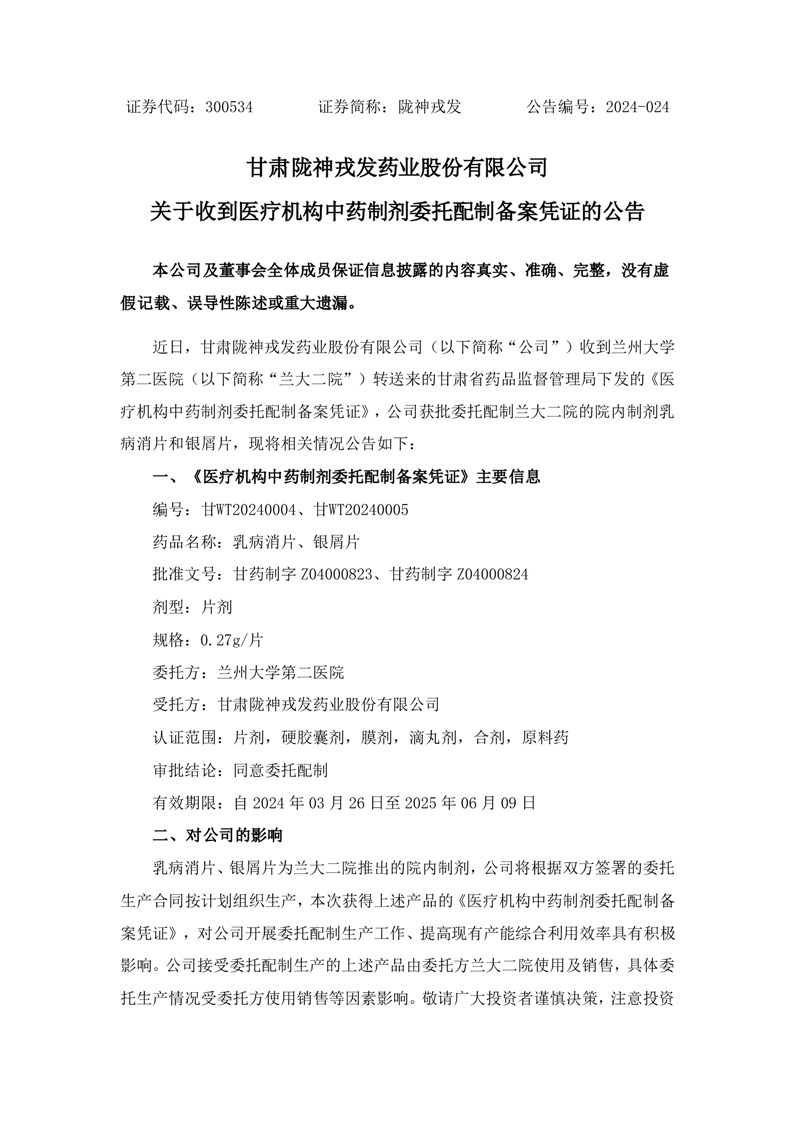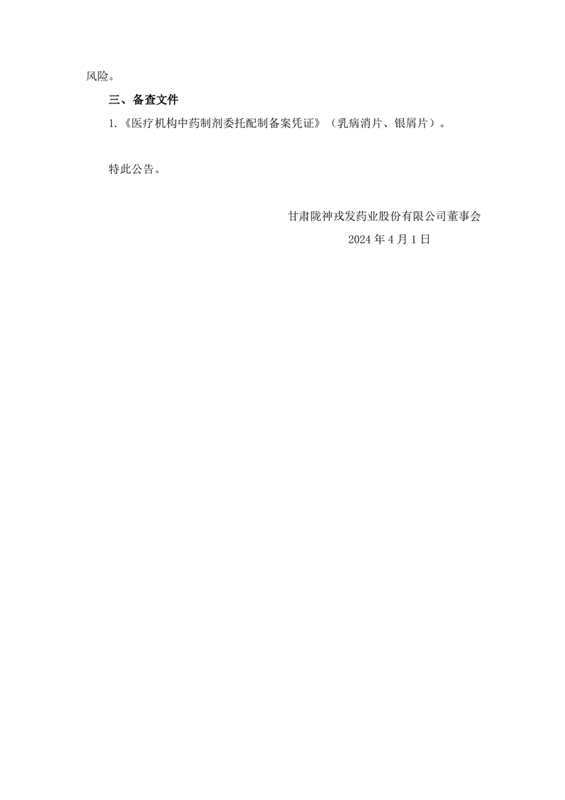 關于收到醫(yī)療機構中藥制劑委托配制備案憑證的公告