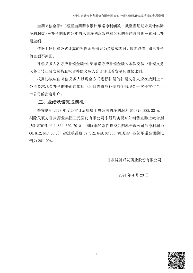 甘肅普安制藥股份有限公司業績承諾完成情況審核報告