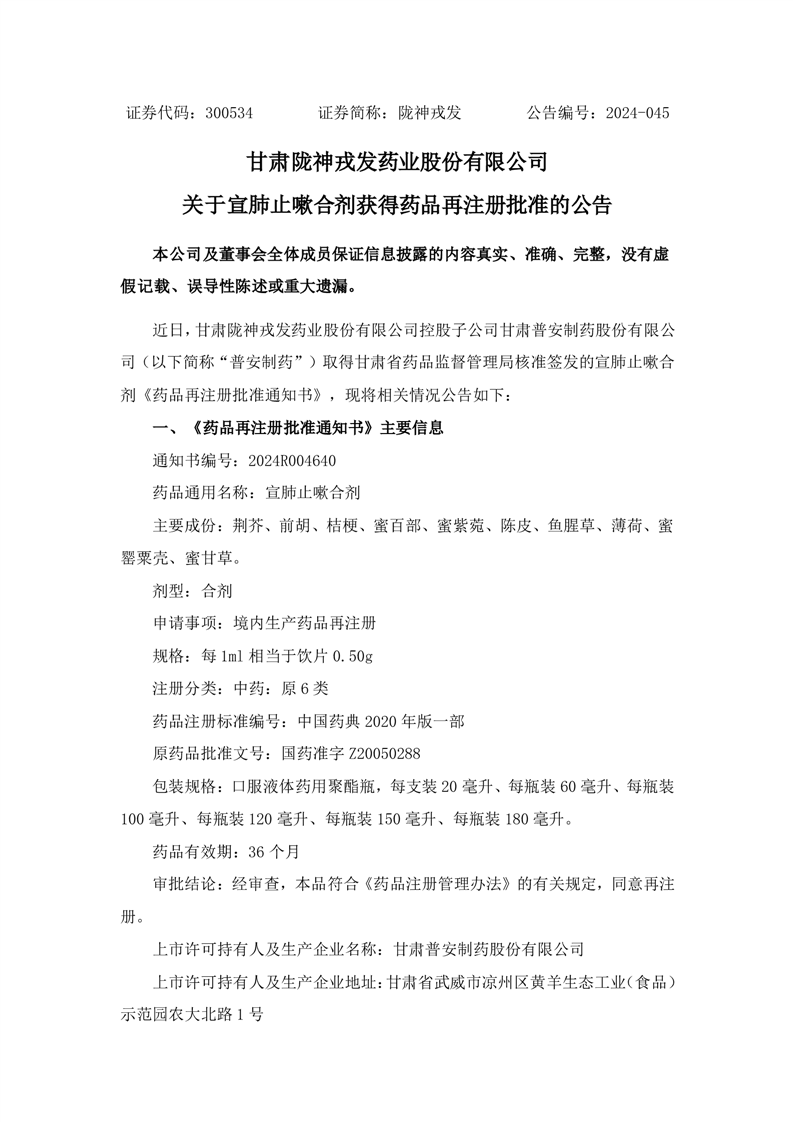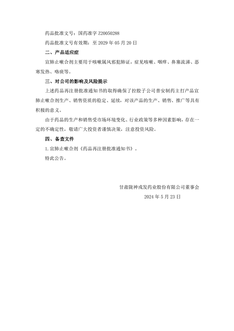 關于宣肺止嗽合劑獲得藥品再注冊批準的公告