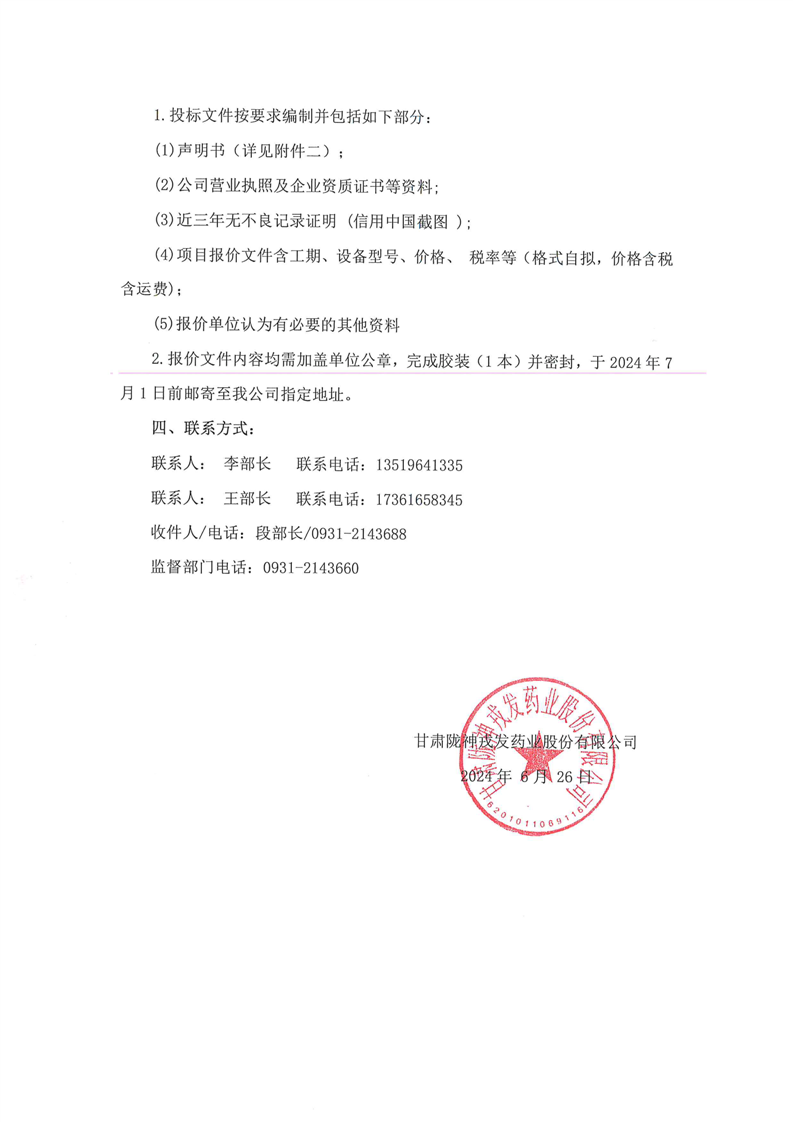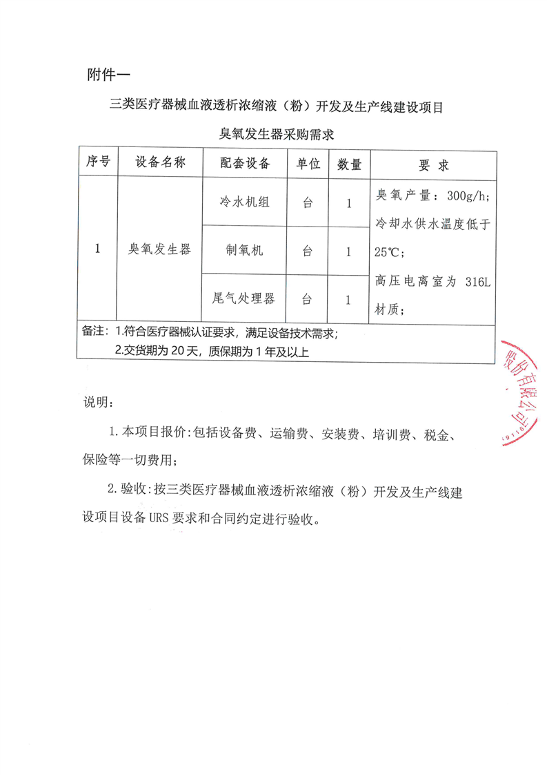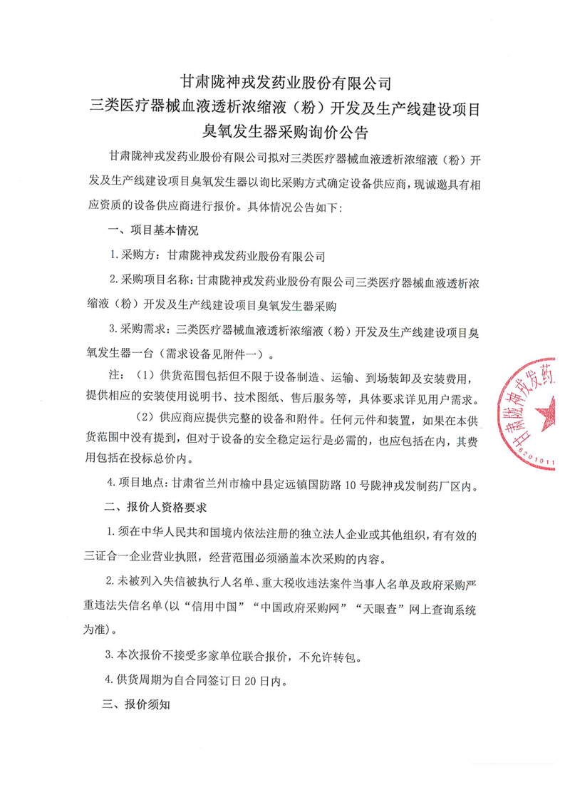 甘肅隴神戎發藥業股份有限公司三類醫療器械血液透析濃縮液(粉)開發及生產線建設項目臭氧發生器采購詢價公告