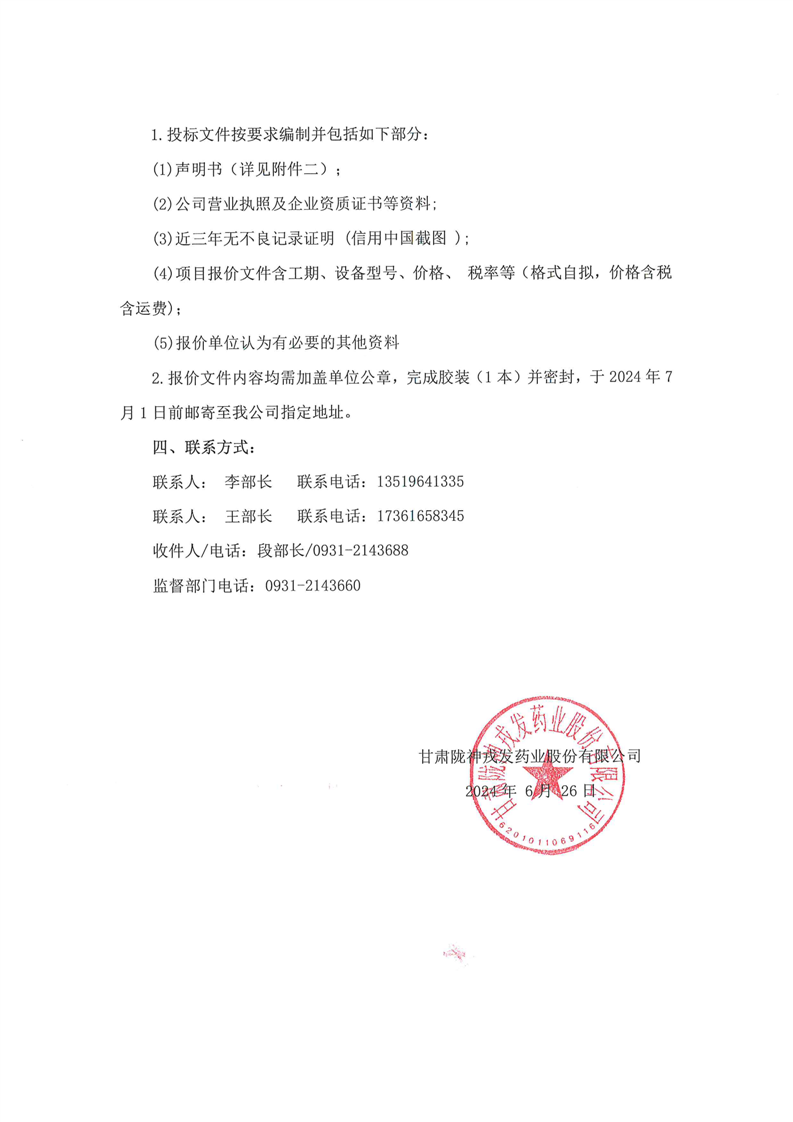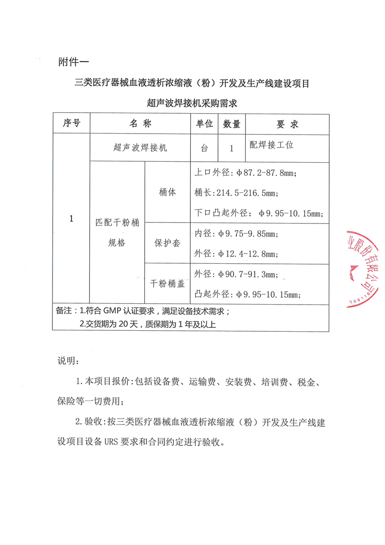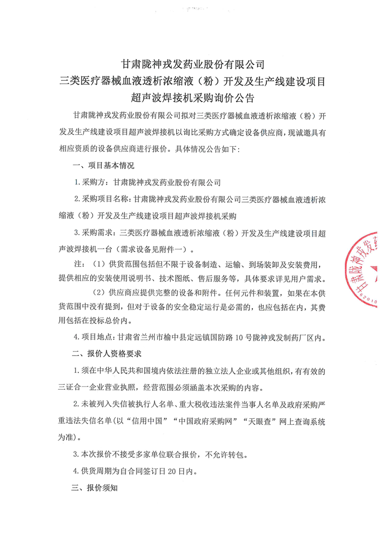 甘肅隴神戎發藥業股份有限公司三類醫療器械血液透析濃縮液(粉)開發及生產線建設項目超聲波焊接機采購詢價公告