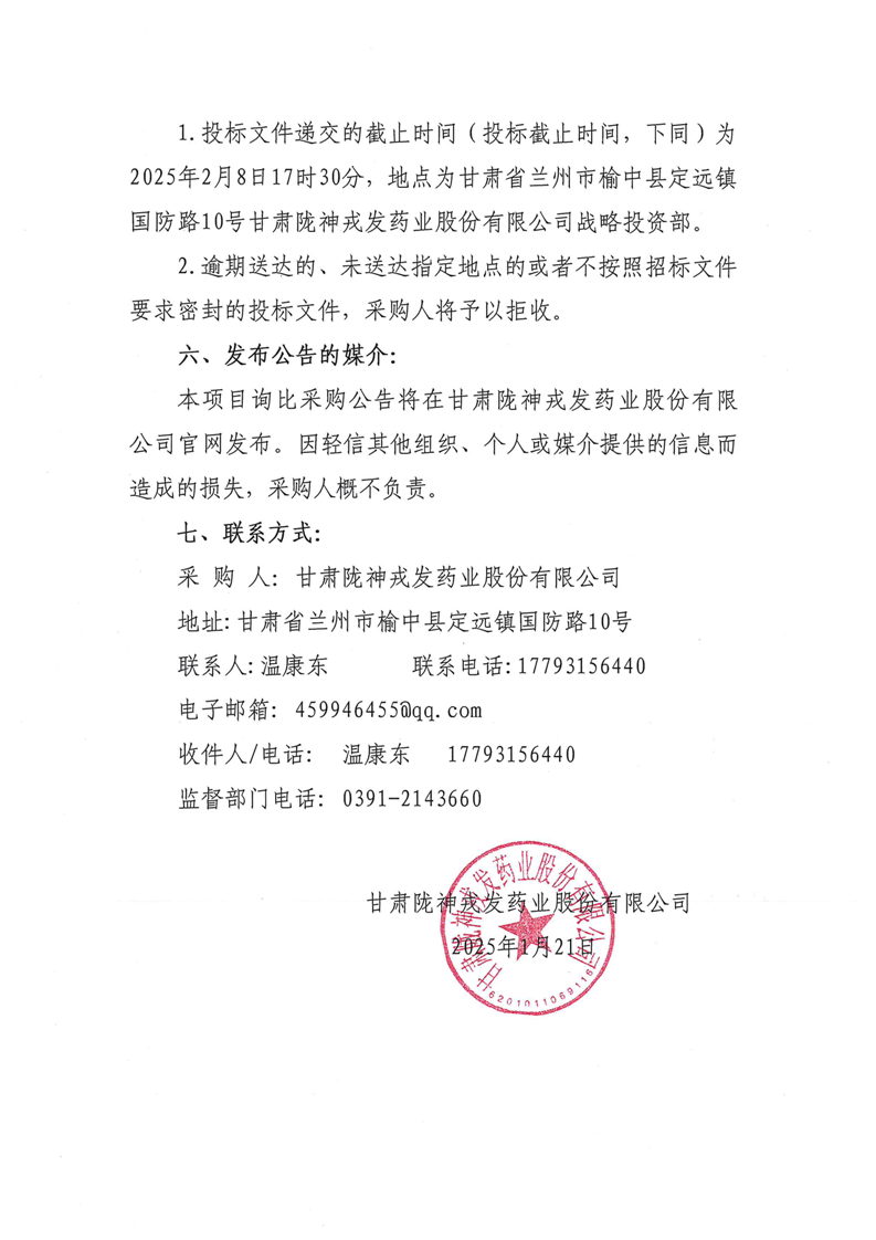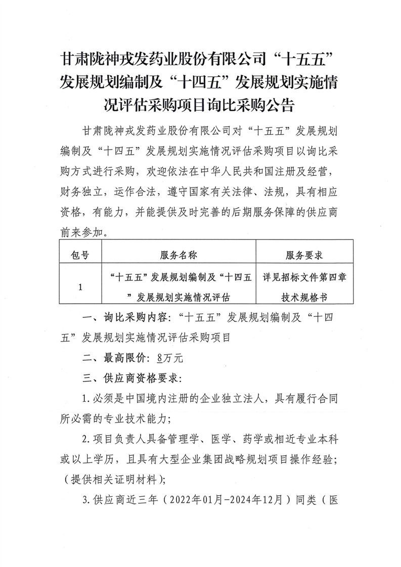 甘肅隴神戎發(fā)藥業(yè)股份有限公司“十五五”發(fā)展規(guī)劃編制及“十四五”發(fā)展規(guī)劃實(shí)施情況評(píng)估采購(gòu)項(xiàng)目詢比采購(gòu)公告