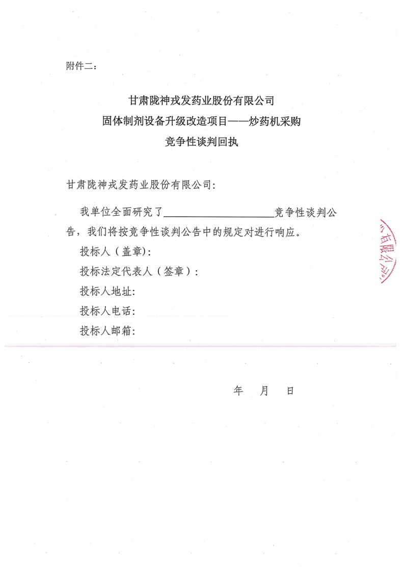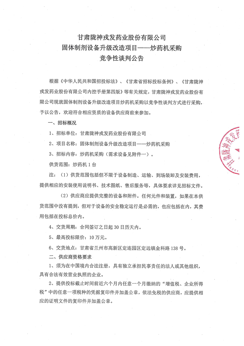 甘肅隴神戎發藥業股份有限公司固體制劑設備升級改造項目——炒藥機采購競爭性談判公告