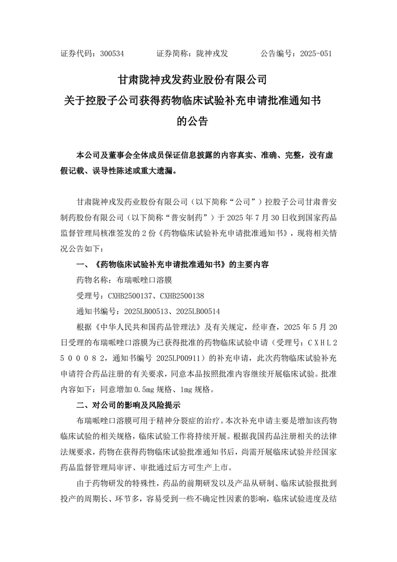 關于控股子公司獲得藥物臨床試驗補充申請批準通知書的公告